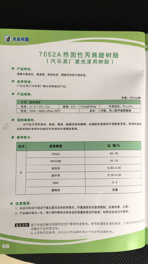 大昌树脂 7052A热固性丙烯酸树脂(汽车原厂罩光漆用树脂)