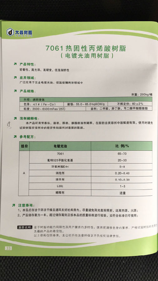 大昌树脂 7061热固性丙烯酸树脂(电镀光油用树脂)