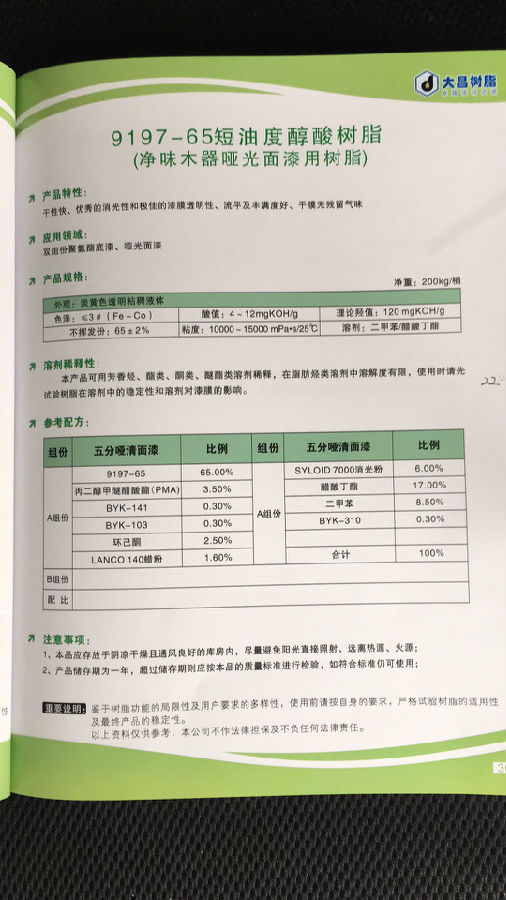 大昌树脂 9197-65短油度醇酸树脂(净味木器哑光面漆用树脂)