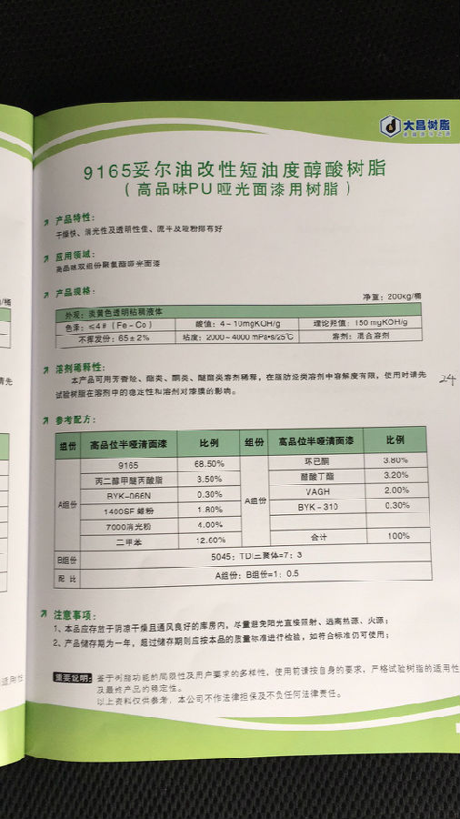 大昌树脂 9165妥尔油改良性短油度醇酸树脂(高品味PU哑光面漆用树脂)