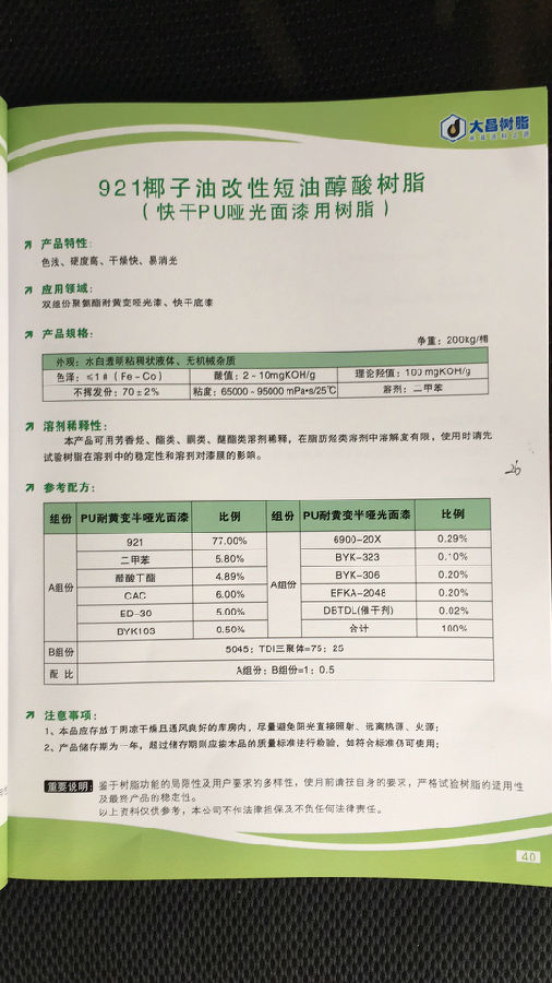 大昌树脂 921椰子油改良性短油度醇酸树脂(快干PU哑光面漆用树脂)