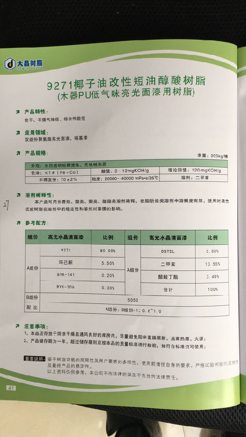 大昌树脂 9271椰子油改良性短油度醇酸树脂(木器PU低气味亮光面漆用树脂)