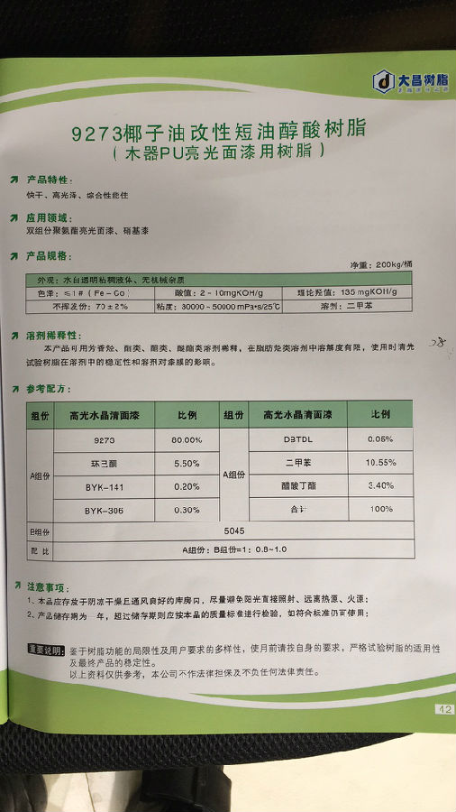 大昌树脂 9273椰子油改良性短油度醇酸树脂(木器PU亮光面漆用树脂)