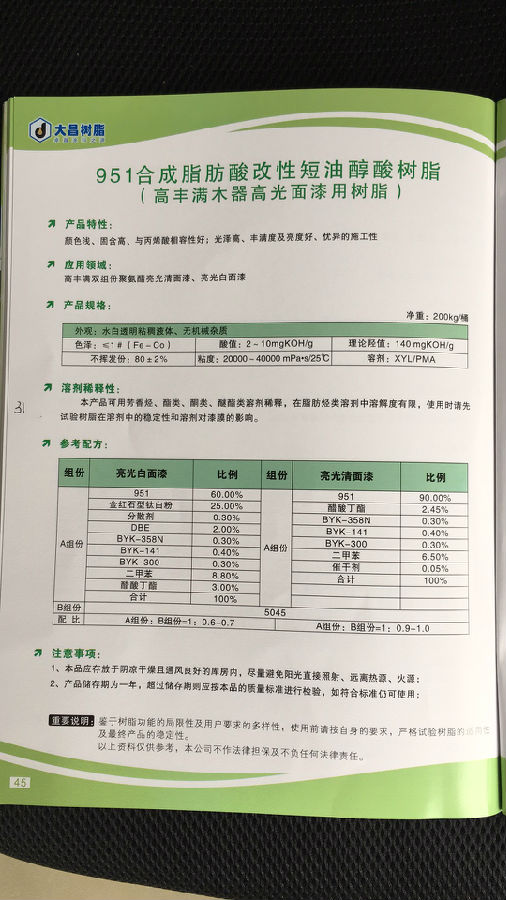 大昌树脂 951合成脂肪酸改性短油度醇酸树脂(高丰满木器高光面漆用树脂)