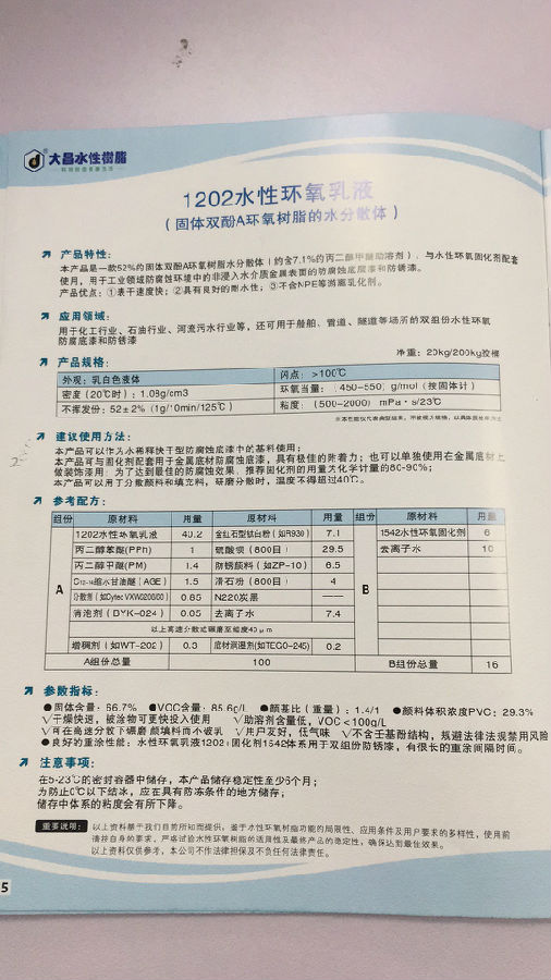 大昌水性树脂 1202水性环氧树脂(改性固体双酚A环氧树脂的水分散体)