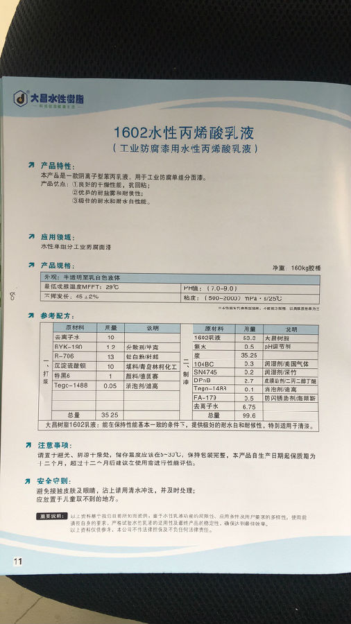 大昌水性树脂 1602水性丙烯酸乳液(工业防腐漆用水性丙烯酸乳液)