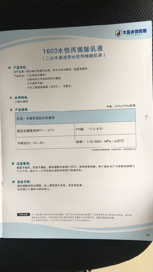 大昌水性树脂 1603水性丙烯酸乳液(工业木器漆用水性丙烯酸乳液)