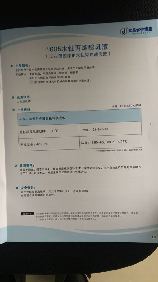 大昌水性树脂 1605水性丙烯酸乳液(工业塑胶漆用水性丙烯酸乳液)