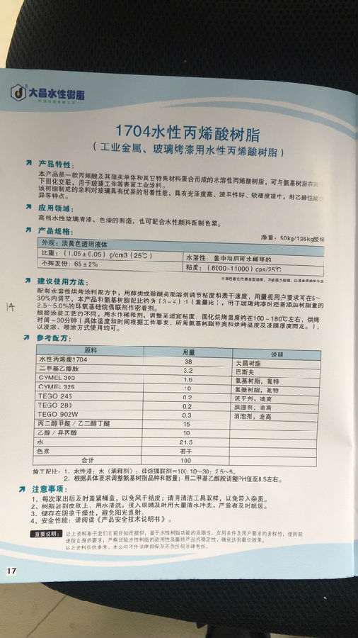 大昌水性树脂 1704水性丙烯酸乳液(工业金属 玻璃烤漆用水性丙烯酸乳液)