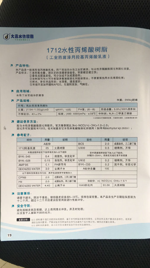 大昌水性树脂 1712水性丙烯酸乳液(工业防腐漆用羟基丙烯酸乳液)