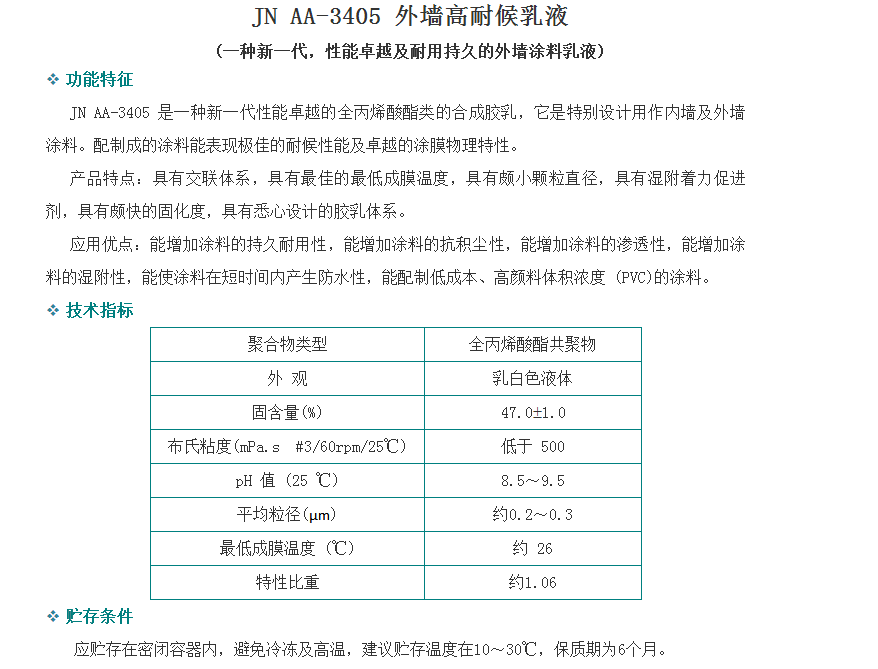 广州骏能化工 丙烯酸乳液 JN AA-3405 外墙高耐候乳液 (一种新一代,性能卓越及耐用持久的外墙涂料乳液)