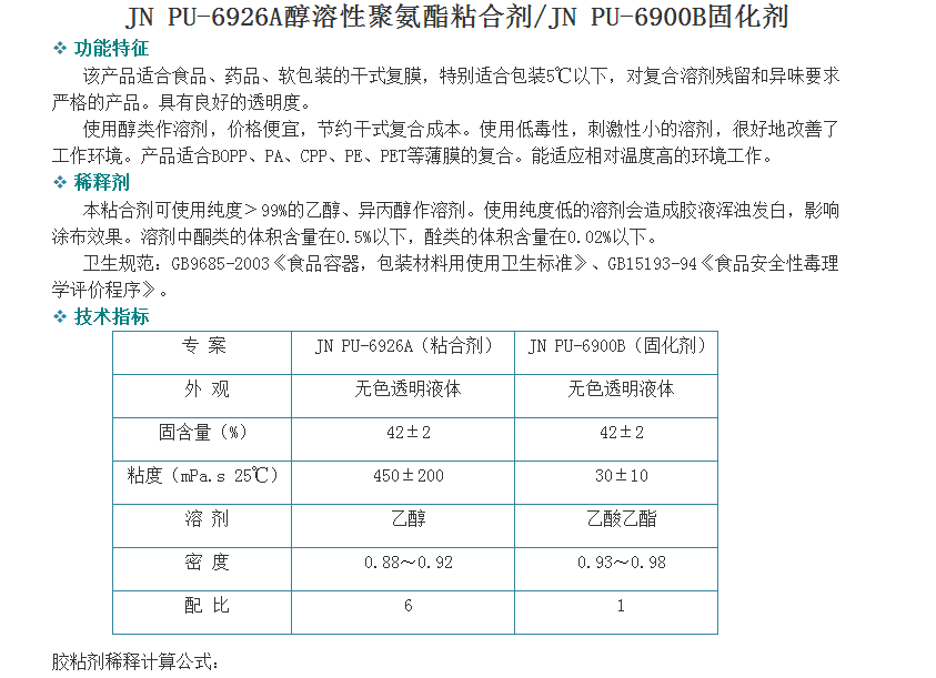 广州骏能化工 溶剂型聚氨酯 JN PU-6926A醇溶性聚氨酯粘合剂/JN PU-6900B固化剂